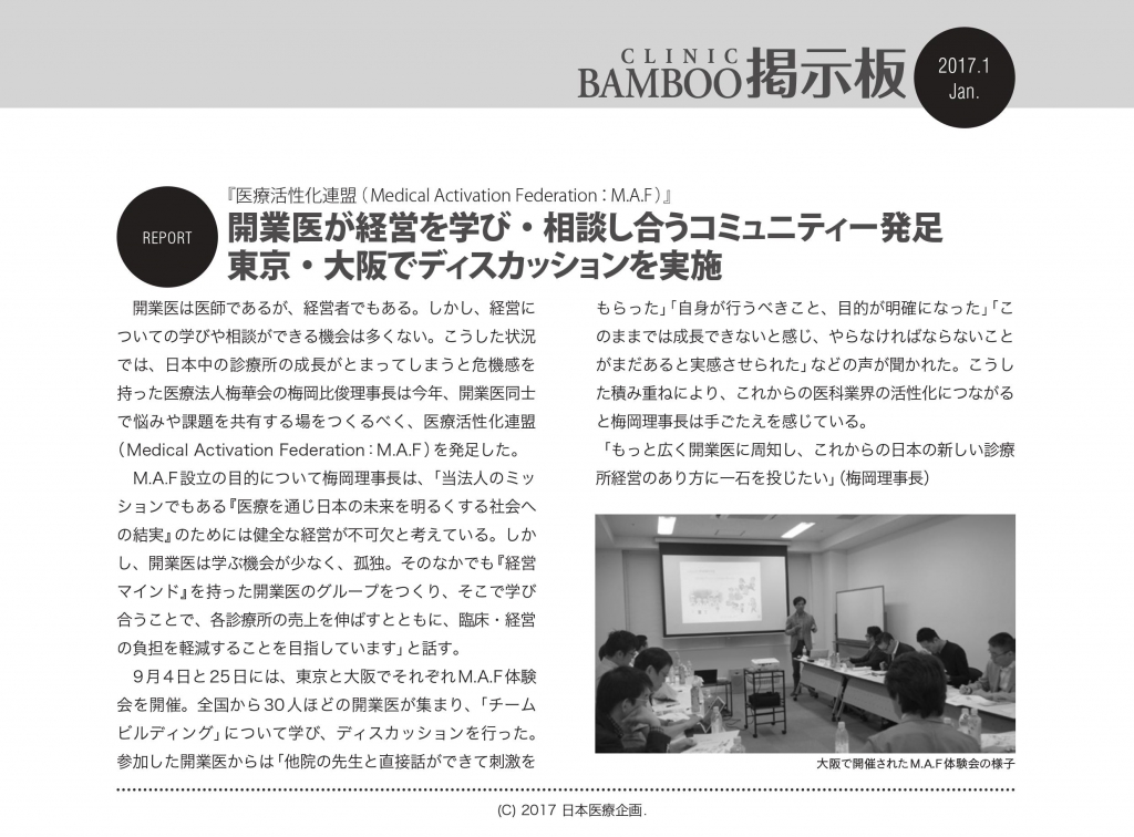 クリニックばんぶう1月号掲載 2017 1/30 この度、日本医療企画発行【クリニックばんぶう 2017年1月号】に M.A.Fの活動が掲載されました。 2016年に実施した東京と大阪での体験会を レポートいただき、全国の先生方にM.A.Fを知っていただける機会となりました。 その他・イベント URLをコピーしました! 2017年1月【集患】セミナー開催 2017年4月【仕組み化】セミナー開催 関連記事 2026年2月(東京)クリニック経営NEXTセミナーレポート 2026年2月11日 2026年2月(東京)クリニック経営COREセミナーレポート 2026年2月8日 2026年1月(大阪)クリニック経営COREセミナーレポート 2026年1月25日 2025年10月(東京)クリニック経営セミナーレポート 2025年10月26日 2025年10月(大阪)クリニック経営セミナーレポート 2025年10月5日 2025年9月(沖縄)卓越した右腕リトリートレポート 2025年9月26日 2025年7月(東京)クリニック経営セミナーレポート 2025年7月13日 2025年7月(大阪)クリニック経営セミナーレポート 2025年7月6日
